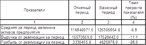 Он равен -2,0498759 и это значит, что в пассивах организации нет капитала, которым можно свободно маневрировать. Коэффициент автономии источников формирования запасов показывает долю собственных оборотных средств в общей сумме основных источников формирования запасов и равен -1,61 , это значит, что у предприятия нет собственных средств для образования оборотных средств в общей сумме источников формирования запасов. Коэффициент обеспеченности запасов собственными источниками и коэффициент обеспеченности также имеют отрицательное значение, т.к. предприятие не имеет собственных средства для образования оборотных средств. Этот факт объясняется большой долей заемных средств в пассивах предприятия. 2.4 Оценка платежеспособности и ликвидности . Платежеспособность предприятия выступает в качестве внешнего проявления финансовой устойчивости, сущностью которого является обеспеченность оборотных активов долгосрочными источниками формирования. Для оценки платежеспособности предприятия используются три относительных показателя, различающихся набором ликвидных активов, рассматриваемых в качестве покрытия краткосрочных обязательств. Мгновенную платежеспособность предприятия характеризует коэффициент абсолютной ликвидности , показывающий, какую часть краткосрочной задолженности может покрыть организация за счет имеющихся ден. средств и краткосрочных фин. вложений, быстро реализуемых в случае надобности. Значение коэффициента 0,47, что больше распространенного в экономической литературе коэффициента (0,2). Платежеспособность предприятия с учетом предстоящих поступлений от дебиторов характеризует коэффициент уточненной ликвидности. Он показывает, какую часть текущей задолженности организация может покрыть в ближайшей перспективе при условии полного погашения дебиторской задолженности. Значение коэффициента 1,34. Прогнозируемые платежные возможности организации при условии погашения краткосрочной дебиторской задолженности и реализации имеющихся запасов (с учетом компенсации осуществленных затрат) отражает коэффициент покрытия. Значение коэффициента 1, 81 и 1,42. Нормативное значение коэффициента кп ≥ 2. Значение коэффициента меньше нормативного, также видна отрицательная динамика коэффициента. Для прогноза изменения платежеспособности предприятия рассчитаем коэффициент утраты платежеспособности: К в.у.п. = 0,614. Значение коэффициента подтверждает тенденцию к уменьшению платежеспособности в краткосрочной перспективе. Общая платежеспособность предприятия определяется как способность покрыть все обязательства предприятия всеми ее активами. Основным фактором, обуславливающим общую платежеспособность, является наличие у предприятия реального собственного капитала. Коэффициент общей платежеспособности равен 1,26. 2.5 Показатели деловой активности и эффективности деятельности предприятия.Рентабельности продаж показывает, сколько прибыли приходится на единицу реализованной продукции. К1 R равен 21,39 и 26,40 . Рост коэффициента является следствием роста цен при постоянных затратах на производство или снижение затрат на производство при постоянных ценах. Рентабельность всего капитала фирмы показывает эффективность использования всего имущества предприятия. К2 R равен 2.85% Рентабельность основных средств и про