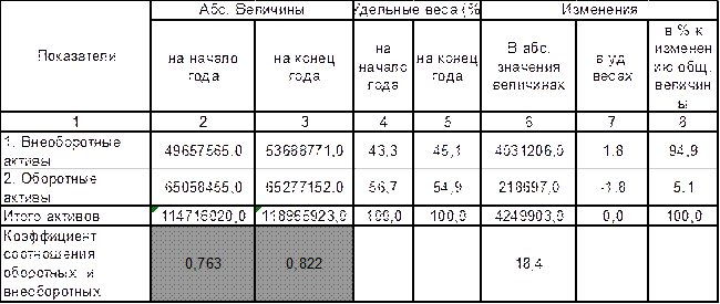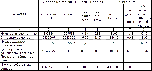 Таблица №3 Оценка структуры активов. В ходе оценки структуры активов можно отметить, что за отчетный период резкого изменения коэффициента соотношения оборотных и внеоборотных активов не произошло. Наибольшая доля в изменении активов приходится на внеоборотные активы (94,9%) . Это указывает на расширение предприятия, так как компания является молодой, эта тенденция встречается в большинстве случаев. Более конкретную оценку структуры внеоборотных и оборотных активов приводится в таблицах далее. Таблица №4 Оценка структуры внеоборотных активов. Оценка структуры внеоборотных активов предприятия представляет нам след. ситуацию: Наибольшую долю в структуре внеоборотных активов представляют: · Долгосрочные финансовые вложения · Незавершенное строительство Наибольшую долю прироста составляют статьи активов: · Незавершенное строительство · Долгосрочные финансовые вложения, Что свидетельствует об ориентации на создание материальных условий расширения основной деятельности предприятия и об усилении финансово-инвестиционной стратегии предприятия. На лицо уменьшение и без того маленькой доли нематериальных активов. По данным табл. «Оценка структуры оборотных активов» проводится анализ структуры и динамики оборотных активов. Таблица №5 Оценка структуры оборотных активов.