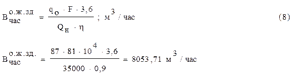 где: qо – укрупнённый показатель максимального часового расхода тепла на отопление жилых зданий, Вт/м2 общей площади прил.3, [3], qо = 87 Вт/м2 F – общая площадь, м2 F = f∙N (9) f = 18 м2 /чел. F = 18∙45000 = 810000 м2 η – КПД установок при работе на замещаемом топливе, η = 0,9