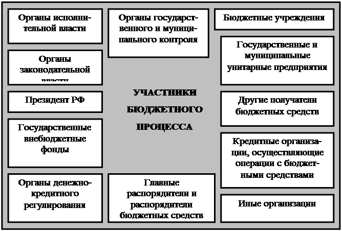 Участниками бюджетного процесса являются (рис. 1):[6] · Президент Российской Федерации; · органы законодательной (представительной) власти; · органы исполнительной власти (высшие должностные лица субъектов РФ, главы местного самоуправления, финансовые органы, органы, осуществляющие сбор доходов бюджетов, другие уполномоченные органы); · органы денежно-кредитного регулирования; · органы государственного и муниципального финансового контроля; · государственные внебюджетные фонды; · главные распорядители и распорядители бюджетных средств; · иные органы, на которые законодательством Российской Федерации, субъектов РФ возложены бюджетные, налоговые и иные полномочия. Участниками бюджетного процесса также являются бюджетные учреждения, государственные и муниципальные унитарные предприятия, другие получатели бюджетных средств, кредитные организации, осуществляющие отдельные операции со средствами бюджетов. Полномочия всех участников бюджетного процесса установлены Бюджетным кодексом РФ. Для органов федерального уровня кроме Бюджетного кодекса основным законодательным актом являются ежегодно принимаемые федеральные законы о федеральном бюджете[7] и о бюджетах внебюджетных фондов.[8] На территориальном и местном уровне кроме ежегодных законов о бюджетах субъектов РФ,[9] бюджетах муниципальных образований[10] и бюджетах территориальных внебюджетных фондов[11] принимаются специальные законодательные акты регионального[12] и муниципального уровня,[13] регулирующие бюджетный процесс. Все законодательные акты о бюджетном процессе получают свое развитие в нормативных актах, принимаемых органами исполнительной власти. Законодательные (представительные) органы, представительные органы местного самоуправления рассматривают и утверждают бюджеты и отчеты об их исполнении, осуществляют последующий контроль за исполнением бюджетов, формируют и определяют правовой статус органов, осуществляющих контроль за исполнением бюджетов соответствующих уровней бюджетной системы РФ, осуществляют другие полномочия в соответствии с Бюджетным кодексом РФ, иными правовыми актами бюджетного законодательства РФ. Аналогичные полномочия законодательные (представительные) органы осуществляют по отношению к государственным внебюджетным фондам. Законодательные органы не имеют права создавать свои резервные фонды, а также выполнять отдельные функции по исполнению бюджетов (кроме органов местного самоуправления, совмещающих функции законодательных и исполнительных органов). [14] Органы исполнительной власти, органы местного самоуправления осуществляют составление проекта бюджета, внесение его с необходимыми документами и материалами на утверждение законодательного (представительного) органа, представительного органа местного самоуправления, исполнение бюджета, в том числе сбор доходов бюджета, управление государственным, муниципальным долгом, ведомственный контроль за исполнением бюджета, представляют отчет об исполнении бюджета на утверждение законодательных (представительных) органов, представительных органов местного самоуправления, осуществляют другие полномочия. Аналогичные полномочия органы исполнительной власти осуществляют по отношению к государственным внебюджетным фондам.[15] Банк России совместно с Прави