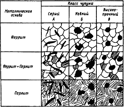 2. Модель строения чугуна. Чугун отличается от стали только наличием графитовых включений, определяющих специальные свойства чугунов. В зависимости от формы графита и условий его образования различают следующие группы чугунов: серый – с пластинчатым графитом; высокопрочный – с шаровидным графитом; ковкий – с хлопьевидным графитом. Схемы микроструктур чугуна в зависимости от металлической основы и формы графитовых включений представлены на рис. 4