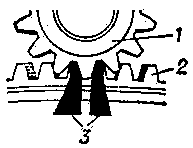 Рис. 4. Зубострогальный станок. Схема нарезания зубьев на коническом зубчатом колесе: 1 — обрабатываемое зубчатое колесо; 2 — производящее зубчатое колесо; 3 — зубострогальные резцы производящего колеса.