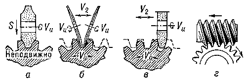 Рис. 6. Схемы зубошлифования: а — по методу профильного копирования фасонным шлифовальным кругом; б — по методу обкатки двумя тарельчатыми шлифовальными кругами; в — по методу обкатки одним дисковым шлифовальным кругом, имеющим профиль зуба рейки; г — по методу обкатки абразивным червяком; Vu и Vg — скорости вращения соответственно инструмента (шлифовального круга) и детали (зубчатого колеса); S — поперечная подача шлифовального круга; V2 — скорость возвратно-поступательного движения шлифовальных кругов.