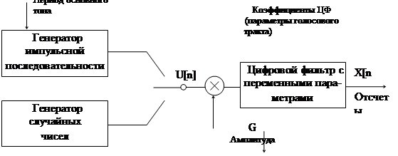 Рисунок 14 - Модель источника речи На временном интервале порядка 10ms характеристики ЦФ можно считать неизменными. На каждом таком интервале ЦФ может быть охарактеризован совокупностью своих коэффициентов. В случае вокализованной речи ЦФ возбуждается генератором квазиканонической импульсной последовательности, расстояние между соседними импульсами которого соответствует периоду основного тона. На интервалах невокализованной речи ЦФ возбуждается генератором случайных чисел, который вырабатывает шумовой сигнал с равномерной спектральной плотностью. В обоих случаях сигнал, поступивший на ЦФ, управляется по амплитуде. На рассмотренной модели базируются многочисленные способы представления речевых сигналов. По сложности реализации эти способы кодирования речи занимают широкий диапазон от простейшей периодической дискретизации до оценок параметров модели изображенной на рис.14. Существует несколько подходов к сжатию речевых сигналов: - кодирование формы волны речевого сигнала; - кодирование параметров речевого тракта человека и источника возбуждения; - кодирование символьной информации (фонем); - кодирование лингвистической информации (слов, фраз и т.п.). 1.1 Непосредственное кодирование формы речевого сигналаИсходный речевой сигнал представляет собой акустическую волну (волна давления в воздухе), которую можно преобразовать в электрический сигнал с помощью микрофона. Будем считать, что спектр речевого сигнала лежит в диапазоне от 100 до 4000 гц. Динамический диапазон изменения амплитуды, достаточный для описания речевых сигналов, составляет 12 двоичных разрядов. Первым шагом, обеспечивающим сжатие речевого сигнала, является попытка обеспечения равномерной относительной точности измерения значения амплитуды сигнала. Для этого 14-12-ти разрядный динамический диапазон амплитуды разбивают на 8 логарифмических поддиапазонов, в каждом из которых значение амплитуды кодируют 5 разрядами и, таким образом, достигают сокращения информации до 64000 бит/с (кодирование по m- и A- законам в соответствии со стандартом ITU -G.711). Следующим шагом является адаптивная дифференциальная импульсно-кодовая модуляция (АДИКМ), (например, в соответствии со стандартами G.721 или G.726 8-40000 бит/с), с помощью которой осуществляют кодирование (аппроксимацию) степени приращения амплитуды сигнала во времени. Таким путем удается достичь степени сжатия речевого сигнала порядка 32000-16000 бит/сек., причем приемлемое (коммерческое) качество речи (по критерию отношения: полезный_сигнал/шум) обеспечивается до 24000 бит/сек. При более низких скоростях кодирования сохраняется разборчивость речи, но характерны сильные нелинейные и частотные искажения сигнала и ухудшение отношения сигнал/шум. Дальнейшее уменьшение информационной емкости сигнала с помощью данного подхода считается неэффективным. 1.1.2. Параметрическое кодирование Низкоскоростное кодирование складывается из двух основных процессов: - параметрическое представление речевого сигнала минимальным набором параметров, характеризующих источник возбуждения и акустический фильтр, определяющий передаточную функцию голосового тракта; - дискретизация речевых параметров для их передачи по каналу связи при использовании минимальной емкости канала. Для параметрического описания речи обычно используется подх