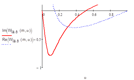 Значению степени затухания ψ =0,75 соответствует степень колебательности m=0.221 Определим интервал частот по расширенной АФЧХ ОР. Для этого получим расширенную АФЧХ ОР Wоб.р (m, ω). Определим значения частот, при которых расширенная АФЧХ ОР пересекают оси координат третьего квадрата. Первое значение частоты может быть получено, если приравнять к нулю действительную часть расширенной АФЧХ ОР и решить полученное уравнение относительно «ω». Второе значение частоты может быть получено, если приравнять к нулю мнимую часть расширенной АФЧХ ОР и решить полученное уравнение относительно «ω». Поскольку высокой точности при определении интервала частот не требуется, то проще эти уравнения решить графически. Для этого построим вспомогательные графики зависимости действительной и мнимой частей от частоты. График зависимости действительной и мнимой частей от частоты