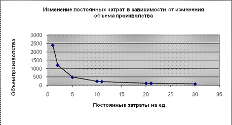 Размер общих постоянных затрат не зависит от изменений объема производства, они будут постоянны при любых колебаниях объема. Зависимость постоянных затрат на единицу продукции от изменяющегося объема производства.
