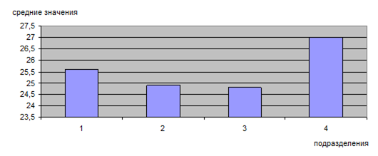 Рис. 9. Средние значения баллов, полученных по удовлетворенности трудом работников подразделений №1, №2, №3 и №4. Примечание: 1 – подразделение №1; 2 – подразделение №2; 3 – подразделение №3; 4 – подразделение №4. Так, на рисунке 9 видно, что наибольший уровень удовлетворенности трудом наблюдается в подразделении №4, а наименьший в подразделении №3 и №2. Это свидетельствует о том, что работники подразделения №4 удовлетворены условиями труда, содержанием труда, отношениями между людьми в труде и организационными аспектами труда больше, чем работники подразделений №2 и №3, а также что мера удовольствия, получаемого от работы у сотрудников подразделения №4 является выше, чем в подразделениях №2 и №3, где степень удовлетворенности трудом по сравнению с другими подразделениями наименьшая. 3.3 Исследование преданности организации работников разных подразделений Исследование преданности работников организации проводилось с помощью методики «Оценка лояльности сотрудника к организации» (Почебут Л.Г., Королева О.Е.). Данные изображены на рисунке 10. Статистический анализ данных осуществлялся с помощью Q – критерия Розенбаума.