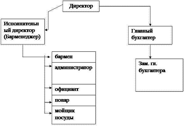 Рисунок 2 - Структура управления предприятием Преимущества данной структуры в том, что прослеживается: - четкая система взаимных связей функций и подразделений; - четкая система единоначалия - один руководитель сосредотачивает в своих руках руководство всей совокупностью процессов, имеющих общую цель; - ясно выраженная ответственность; - быстрая реакция исполнительных подразделений на прямые указания вышестоящих. Поскольку предприятие небольшое, у директора ООО «Эгоист» один заместитель – барменеджер, которому подчиняются: администраторы, бармены, повара, официанты и мойщики посуды. Бухгалтерия состоит из главного бухгалтера и его заместителя. Главный бухгалтер подчиняется непосредственно директору предприятия. Бухгалтерия осуществляет учет средств предприятия и хозяйственных операций с материальными и денежными ресурсами, устанавливает результаты финансово-хозяйственной деятельности предприятия, производит финансовые расчеты с заказчиками и поставщиками, связанные с реализацией готовой продукции, приобретением необходимого сырья, топлива, материалов. В ресторане «Эгоист» стиль управления является демократичным. Руководитель, несмотря на свои прекрасные качества менеджера, при принятии какого-либо решения обязательно выслушивает точку зрения компетентного в данном вопросе работника. Таким образом, работники в определенной степени тоже задействованы в управлении. Доля работников с высшим образованием достаточно велика и составляет 42,9% в общей численности работающих, 35,7% работников предприятия имеют средне-специальное образование. На предприятии уделяется большое внимание профессиональной подготовке и повышению квалификации персонала. Всего доля сотрудников, имеющих профессиональное образование, составляет более 60%, что является положительным фактором. По половому составу мужчины составляют 78,6% от всех работающих, женщины – 21,4%. В таблице 2 представлены показатели, характеризующие численность персонала по возрастному составу. Таблица 2 - Численность персонала по возрастному признаку за 2007-2008 гг.