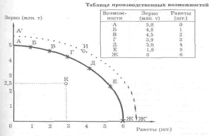 где MB (marginal benefit) — предельные выгоды, МС (marginal cost) — предельные издержки. Производственные возможности ( production capacity ) — возможности общества по производству экономических благ при полном и эффективном использовании всех имеющихся ресурсов при данном уровне развития технологии. Возможный выпуск продукции характеризует кривая производственных возможностей. Поясним это на условном примере. Допустим, что в обществе производятся лишь два блага: зерно и ракеты. Если общество использует свои ресурсы для производства только зерна, то оно производит его 5 млн. т; если же только для производства ракет, то их производится 6 штук. При одновременном производстве обоих благ возможны следующие сочетания (см. рис. 1). Из таблицы видно, что всякое увеличение производства ракет (с 0 до 6 штук) снижает производство зерна (с 5 млн. до 0 т), и наоборот. Линия АБВГДЕЖ, которую называют кривой производственных возможностей ( production possibility curve ) , показывает альтернативные варианты при полном использовании ресурсов. Все точки, расположенные внутри фигуры ОАЖ, означают неполное использование ресурсов, например точка К (одновременное производство 2,5 млн. т зерна и трех ракет). И наоборот, любая производственная программа, характеризуемая точками за пределами фигуры ОАЖ, не будет обеспечена наличными ресурсами (например, точка И). Кривая производственных возможностей обычно имеет выпуклую форму (вогнута к началу координат). Это означает, что, изменяя структуру