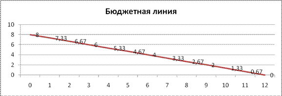 Доход потребителя составляет 12 долл. Цена товара А составляет 1.5 долл. Цена товара Б равна 1 долл. Составить таблицу комбинаций из товаров А и Б, доступных потребителю приданном доходе и построить на графике его бюджетную линию.
