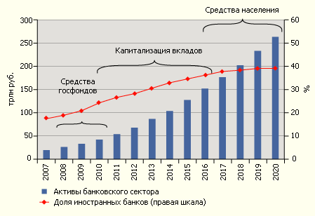 2) В рамках инерционного сценария ключевые ограничения, как в сфере укрепления внутренней ресурсной базы, так и в сфере расширения спроса на банковские услуги, сохранятся, возможности по снижению зависимости от внешних рынков капитала не будут реализованы, хотя макроэкономические условия как в России, так и в мире в целом останутся благоприятными. Это сделает невозможным удовлетворение потребностей российских экономических агентов в качественных банковских услугах силами российских кредитных институтов. Основная причина реализации инерционного сценария — медленная реализация мер, необходимых для развития финансового рынка, как это происходило в 2000—07 гг. Вплоть до 2015 г. Сохранится высокая зависимость темпов роста от доступа к внешним ресурсам, что не позволяет говорить об экономическом суверенитете. В результате доля внешних ресурсов в периоды «дешевых денег» на внешнем рынке будет возрастать до 35—40% пассивов, а даже незначительное удорожание денег на внешнем рынке будет останавливать рост банковской системы и провоцировать мини-кризисы. К моменту очередных выборов в 2012 г. ресурсы государства под давлением общественного мнения будут направлены на бюджетные инвестиции в экономику и отчасти рекапитализацию госбанков, пострадавших от внешних шоков. По этой причине будет упущена возможность создания работающих схем рефинансирования, которые могли бы стать импульсом для развития национальных кредитных институтов. Схема аутсорсинга финансовой системы будет демонтирована только к 2011—12 гг., когда существенно сократятся госсбережения, как накопленные, так и текущие. Кроме того, к этому времени активные участники существующей аутсорсинговой схемы — контролируемые частным российским капиталом банки — будут вытеснены на периферию банковской системы. Вероятно, на смену аутсорсингу придет модель гипертрофированного развития розничного кредитования, при которой располагающие дешевыми ресурсами иностранные банки кредитуют россиян под покупку потребительских товаров. Длительная консервация схема аутсорсинга финансовой системы означает, что финансовый сектор будет по-прежнему плохо справляться с трансформацией внутренних сбережений. Крупные компании продолжают получать ресурсы напрямую с мирового рынка, со временем возможен также перенос центров управления ликвидностью крупных холдингов из России ближе к мировым финансовым центрам. В отсутствие специальных государственных программ по обеспечению равного доступа к финансовым услугам, укреплению доверия к банковскому сектору и повышению финансовой грамотности социальные аспекты в деятельности, банки станут учитывать лишь при прямом давлении государства. В 2010—2013 гг. рекапитализированные после ипотечного кризиса иностранные банки развивают активную экспансию на российский рынок, вытесняя или скупая частные российские банки. Благодаря сопутствующему притоку капитала активы банковской системы растут на 5—6% быстрее номинального ВВП. Активность иностранных банков обеспечивает опережающий рост кредитования физических лиц. К 2014 г. этот процесс размывания сегмента частных банков в целом завершается, и темп роста активов резко падает. Выборы 2014 г. иностранные инвесторы рассматривают как дополнительный риск. После 2014 г. интенсифицируется вытеснение