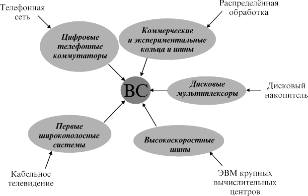 Рис. 1.2. Направление развития сетей. К середине 80-х годов все отмеченные тенденции развития сетей стали сближаться, что привело к разработке современных информационных сетей (рис. 1.2). 2 вопрос. Общая структура ИВС представлена на рис.1.3. Основными компонентами сети являются: · каналы; · системы: абонентская (АбС) и ассоциативная (АсС); · сеть передачи данных.