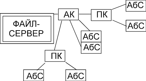 Рис.2.1. Звездообразная структура сети. Наиболее распространенной топологией сети является топология типа “шина”. В этом случае все сетевые компьютеры (АбС) связаны линейно (рис.2.2) с помощью коаксиального кабеля.