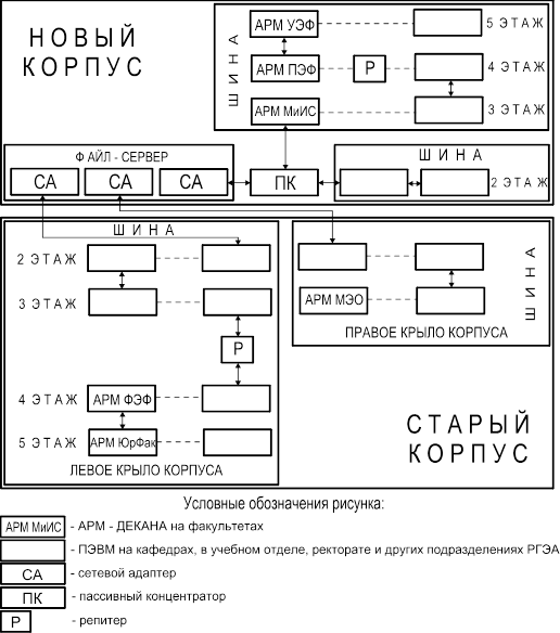 Рис.4.4. Зеркальное отображение серверов. Так как ОС NetWare любой версии обеспечивает одновременный доступ большого количества пользователей к общим ресурсам на файловом сервере, особое место отведено функции сетевой ОС - защита сети. Защита файлового сервера осуществляется на 5 уровнях: 1. Защита входа. 2. Защита привилегий. 3. Защита каталога. 4. Защита атрибутов файла. 5. Защита атрибутов каталога. Защита входа применима ко всем пользователям. Для того, чтобы войти в файловый сервер, пользователи должны знать “имя пользователя” и соответствующий пароль. Защита привилегий используется для регулирования специфических прав пользователей в любом каталоге. Любому привилегированному пользователю могут быть даны восемь различных прав: R - считывать с открытых файлов; W - писать в открытые файлы; O - открывать существующие файлы; C - создавать файлы; D - удалять существующие файлы; P - право владения (создавать, переименовывать, стирать подкаталоги каталога; устанавливать права на привилегии и каталоговые права в каталоге и его подкаталогах ); S - искать каталог; M - модернизировать файловые атрибуты. Защита каталога применяется для управления правами всех привилегированных пользователей в данном каталоге. Данный уровень защиты определяет, какими из установленных прав на уровне “защита привилегий” не может пользоваться конкретный пользователь. Защита атрибутов файла позволяет управлять модификацией или совместным использованием отдельного файла. Этот уровень защиты может иметь четыре значения: · читать, писать / только читать; · общий / не общий (одновременно не может быть использована несколькими пользователями); Существует четыре атрибута каталога, обеспечивающие его защиту: · NORMAL (нормальный) - никакие атрибуты не были установлены (по умолчанию); · HIDDEN (скрытый) - прячет каталог, чтобы его не мог увидеть любой пользователь; · SYSTEM (системный) - используется для работы системы; · PRIVATE (частный) - позволяет пользователю видеть каталог, но не его содержание. 3 вопрос. Установка ЛВС для АСУ РГЭА потребовала решения, прежде всего, трех вопросов: · выбор архитектуры сети; · выбор технологии сети; · выбор способа организации сети. На первом шаге осуществляется выбор архитектуры сети: звезда, кольцо или шина? Поставленная задача решалась исходя из особенности здания РГЭА и расположения в рамках его подразделений, в которых будут установлены АбС сети. В качестве основного критерия, выступал критерий - минимум затрат кабеля, монтажных работ и стоимостных затрат. Учитывая это, была спроектирована архитектура сети, представленная на рис.4.5. Как следует из рисунка для построения сети с учетом перечисленных критериев была выбрана топология - шина. Принимая во внимание , что как в новом, так и в старом корпусе длина шины более 185 м ,был использован Репитер для усиления сигналов. Файл сервер (IBM 486 DX4, част. 100 Мгц, ОП-16 Мбайт, диск-1 Гбайт ) сети установлен в 211ауд. К нему через 3 сетевых адаптера подключены четыре локальных сети. АбС сети установлены на выпускающих кафедрах, деканатах, библиотеке, учебном отделе и других подразделениях РГЭА старого и нового корпусов (около 50 АбС ). Для связи систем сети был использован коаксиальный кабель. На втором шаге построения сети определялась технология сети: Ethernet, Token Ring, Arcnet. Для ЛВС АСУ РГЭА была выбрана технология Ethernet. Чем 