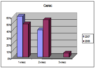 Анализ показал, что по зерновым урожайность возросла за счет увеличения продуктивности яровых, по остальным видам зерновых произошел спад. По многолетним и однолетним травам наметился спад, что связано с плохими погодными условиями - холодной весной, засушливым летом 2008 г. Основными негативными факторами, влияющими на урожайность в растениеводстве ООО "Агрофирма "Ирбитская" является неудовлетворительная агротехника. Так как растениеводство хозяйства производит продукцию в основном для обеспечения животных кормами, необходимо повышать количество и качество заготовляемых кормов, которые в свою очередь должны повысить продуктивность отрасли животноводства хозяйства. Данные анализа качества некоторых кормов хозяйства приведены ниже в графике, из которого видно, что показатели классности сена и силоса в 2008 году уступают показателям 2007 года. Так, доля первоклассного сена снизилась в 2008 году на 19% к уровню прошлого года. Анализ силоса показал, что в 2007 году уровень корма I класса уменьшился на 11%, II класса увеличился на 15%, и добавилось 6% силоса III класса.