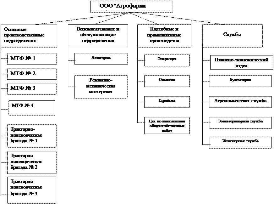 Рис.4 Структура управления ООО "Агрофирма "Ирбитская"В каждом хозяйстве все субъекты производственной деятельности в целях эффективного его функционирования объединены в единую систему – организационную структуру. Организационная структура представляет собой совокупность подразделений хозяйства производственного, вспомогательного, культурно-бытового и хозяйственного назначений, осуществляющих свою деятельность на основе кооперации и разделения труда внутри предприятия. Для ООО "Агрофирма "Ирбитская" характерна традиционная структура организации рис. 5. В настоящее время на предприятии существует бригадная форма организации производства, труда и управления. Хозяйство состоит из трёх производственных бригад и кормоцеха. Всего работающих в трёх бригадах – 350 человек: - бригада №1 – с. Знаменское - 191 человек; - бригада №2 – д.Большая Зверева – 68 человек; - бригада №3 – д.Большой Камыш – 91 человек. На перспективу в хозяйстве будет сохранена организационно-производственная структура управления. Форма организации остаётся бригадной. Согласно «Положения о производственной бригаде», за бригадами закрепляется земля, техника и другие материальные ценности. В связи с широким внедрением коллективных форм организации и оплаты труда непременным условием дальнейшего развития отрасли растениеводства является совершенствование его организационной структуры только в первичном звене – бригадах. Организационная структура хозяйства включает в себя подразделения основного, обслуживающего и вспомогательного производства. К числу подразделений основного производства относятся тракторно-полеводческие бригады и животноводческие фермы, производящие товарную продукцию и продукцию внутреннего оборота (корма, семена и др.) Среди обслуживающих – ремонтная мастерская и автогараж. Общехозяйственные подразделения, находящиеся в непосредственном подчинении у рабочего аппарата предприятия, оказывают внутрихозяйственным подразделениям следующие услуги: Энергоцех – обеспечение производственных и культурно-бытовых подразделений теплом, водой, газом и электроэнергией. Сооружение новых и ремонт действующих объектов и систем энергоснабжения. Стройцех – изготовление столярных изделий, новое строительство и ремонт производственных и культурно-бытовых объектов. Заготовка, вывозка и распиловка леса. Цех по выполнению общехозяйственных работ – доставка и хранение грузов, поступивших в адрес колхоза. Очистка дорог от снега, благоустройство. Заготовка, вывозка на поля и внесение в почву органических удобрений. Очистка и сушка зерна, его размол; подготовка семенного материала. Столовая - организация горячих обедов работников хозяйства.