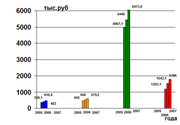 Из таблицы видим, что структура расходов изменилась незначительно. Рассмотрим её по элементам затрат и выявим причины увеличения себестоимости по сравнению с 2005 г. на 340 тыс. руб. или 28 %. Наибольший удельный вес более 30 % занимает оплата труда. На 12 % вырос фонд заработной платы за 2006г.. Среднемесячная заработная плата рабочих остаётся по-прежнему не высокой и составляет 5400 тыс. руб.. Вторая по значимости статья – «Материалы на текущий ремонт» затраты выросли на 165,4 тыс. руб. по сравнению с 2005 г. Предприятием был увеличен объём работ в 2006 году по ремонту жилого фонда. 5 % всех затрат составляет материалы на техническое и санитарное содержании жилищного фонда. На абсолютный рост 27,1 тыс. руб. повлияло удорожание закупающих материалов (соль, песок), для посыпки тротуаров в зимнее время года. Электроэнергия выросла на 18 %, что составляет 4,1 тыс.руб.. На её рост повлияло увеличение тарифа и использование дополнительной мощности (замена перегоревших лампочек, более мощными). Большое относительное отклонение 325 принадлежит статье «Услуги сторонних организаций» фактором Предприятие воспользовалось услугами БТИ, оплатив за работу по технической инвентаризации (регистрация текущих изменений и составление поэтажных планов). 184,7 тыс.руб. или 12 % всех затрат состоят общехозяйственные расходы. Повышение з/пл. АУП и рост тарифов за проезд и почтово-канцелярские принадлежности, повлияли на увеличение расходов по данной статье на 21 %. По 3 % а итогу занимают статьи «Прочие расходы» и « Налоги». По статье «Налоги» отражаются суммы земельного и транспортного налогов, но увеличение затрат 5,7 тыс.руб. повлияли рост налоговых ставок по вышеперечисленным налогам. В «Прочие прямые расходы» включаются расходы, не вошедшие в перечисленные статьи калькуляции. Относительное отклонение составило 26 %, повлекло повышение оплаты услуг аудиторов и страховых компаний. Планируемый рост расходов по содержанию и текущему ремонту жилищного фонда на 2007 г. составляет 243,9 тыс.руб. На увеличение затрат повлияли планируемый рост себестоимости. 2.3. Анализ доходов предприятия Доходами организации признаётся увеличение экономических выгод в результате поступления активов (денежных средств, иного имущества) и (или) погашения обязательств, приводящее к увеличению капитала этой организации, за исключением вкладов участников (собственников имущества). Доходы МУП «ЖКХ-Раменки» складываются из платежей за коммунальные услуги, бюджетных дотаций в виде возмещения разницы в тарифах и прочих доходов. Средства, выделяемые из бюджета, включают в себя: - на убытки; - на благоустройство; - на капитальный ремонт; - на тепло; Следует отметить, что вышеперечисленные виды доходов имеют строго целевой характер и должны направляться соответственно на возмещение затрат по тем видам деятельности, за которые они уплачены. Таким образом, переплату за коммунальные услуги нельзя направлять на погашение убытка от содержания и ремонта жилищного фонда. Более того, при современном состоянии нормативной базы, регулирующей установление ставок и тарифов, а также порядок их взимания, расчёты по меньшей мере, не убыточными, а расходы на содержание и ремонт жилья всегда будут превышать суммы квартплаты, направленной на их погашение. Доходы (в частности выручка от реализации услуг) предприятий поставщико
