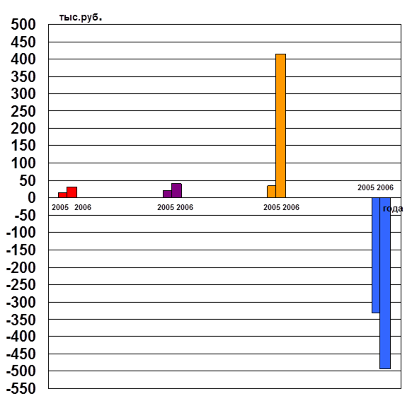 Из таблицы 27 видим, что уровень дохода в исследуемом периоде увеличился на 21 % или 179,8 тыс.руб.. Наибольшую долю порядка 46 % в структуре доходов занимает ассигнования из бюджета. Рост финансирования составил 102 тыс.руб. или 26 %. 1/3 часть дохода состоит из оплаты услуги. Содержание и ремонт жилья, оплаченные населением. В связи с повышением тарифа на эту услугу, выручка увеличилась в 2006 году на 38,4 тыс.руб.. В статью «Прочие доходы» включаются поступления от ЖСК за принятые на эксплуатацию дома, доходы от сдачи имущества в аренду, стоимость материалов, повторно использующих при текущем ремонте и от разборки сносимых строений, пени за просрочку платежей. Увеличение по этой статье составило 21 % или 39.4 тыс. руб.. По этому подразделению также планируется увеличение дохода. Рассмотрев структуру формирования дохода увидим, что 45 % или 332,2 тыс.руб. занимает увеличение по статье «Дотации из бюджета». По статье «Прочие доходы» уменьшение на 123,56 тыс.руб., так как запланированы в 2007г. только поступления от ЖКХ. 2.4. Анализ финансовых результатов Проанализируем работу МУП «ЖКХ-Раменки», для этого сведём в таблицу данные о доходах и расходах по всем подразделениям предприятия. И выявим результат деятельности предприятия. Таблица 28 - Данные для анализа финансового результата по предприятию