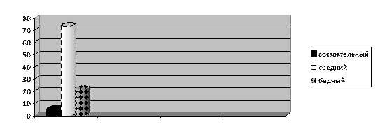 Диаграмма 1. Структура жилищного фонда г. Казани по формам собственности В среднем на 1 жителя Казани по состоянию на 1 января 2002 г. приходилось 19,1 м2 общей площади жилья. Доля частного жилищного фонда в общем жилищном фонде Казани неуклонно растёт и составляет сейчас около 60%.Тем не менее, дома, в которых подавляющее количество квартир являются частными, фактически относятся к муниципальному жилищному фонду, поскольку внешние стены, сети, подвалы и чердаки находятся на балансе муниципалитета. Жилищный фонд города характеризуется высоким уровнем благоустройства: 98,1% муниципальных жилых помещений оборудовано водопроводом, 90,7% - горячим водоснабжением, 97,6% - канализацией, 96,1% - центральным отоплением, 95,2% - газом. Наибольшая доля ветхого жилья сосредоточена в центральных районах города Вахитовском и Кировском (соответственно 7,1% и 7%). В рамках реализации программы расселения ветхого жилищного фонда в период 2004-2005 гг. переселено 11,5 тыс. семей. При этом доля площади ветхих домов во всем жилищном фонде г. Казани уменьшилась с 5,7% в 1997 г. до 2,8% в 2001 г. В 2005 г. для выполнения работ по капитальному ремонту жилищного фонда г. Казани на конкурсной основе отобрано 37 подрядных организаций различной формы собственности. Причем, предприятия негосударственной (частной) формы собственности составляют существенное большинство – 73%. Интенсивные темпы ввода нового жилья и расселения ветхих зданий привели к сокращению числа семей, находящихся в очереди за жильем [2, c94]. Практическая часть Исследование проводилось в ноябре, в Советском районе, до финансового кризиса. На вопросы специально разработанной анкеты ответили 128 испытуемых, в возрасте от 18 до 60 лет, женского и мужского пола. С неполным средним (4,7%), со средним общим (24,2%) и специальным (26,6%), а также с незаконченным высшим, (высшим) (43%) образованиями. Таблица №1 1. Как Вы оцениваете Вашу жизнь с материальной стороны?