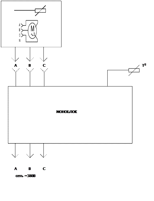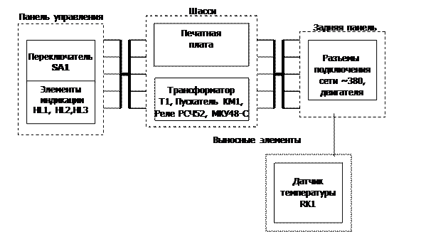 Рис. 2. Блок-схема функциональных узлов электрической схемы изделия УЗ-3Д При разбиении электрической схемы изделия на функциональные узлы на панель управления были помещены следующие элементы: · переключатель SA1 включения и выключения напряжения питания прибора; · светодиодный индикатор HL3, сигнализирующий о включении питания; · светодиодный индикатор HL2, сигнализирующий о неисправности сети; · светодиодный индикатор HL1, сигнализирующий о перегреве двигателя; на заднюю панель были помещены следующие элементы: · предохранитель FU1: · разъемы подключения сети ~380 и двигателя (вилка и розетка): · клемма "Заземление" · монтажные провода к датчику RK1 выносной элемент RK1. Остальные элементы (сетевой трансформатор, печатная плата реле и пускатель) размещены на шасси . 4 .5. Технические характеристики изделия.