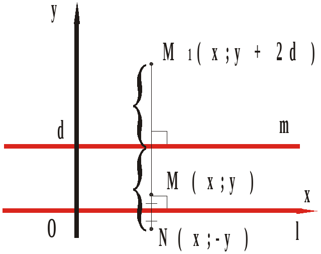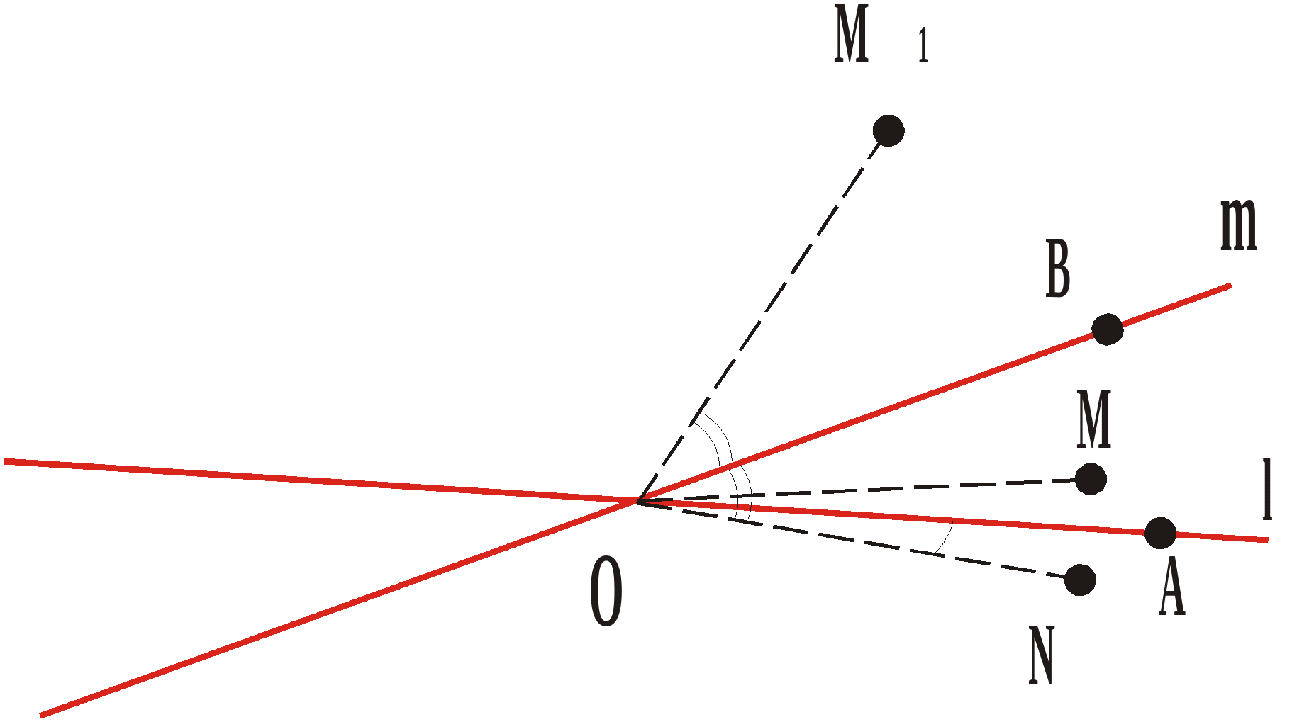 Рис.7 Итак, произвольная точка М(x;y) перешла в точку М1(x;y+2d), т.е. в такую точку М1, –→ → что ММ1 = а{0; 2d}. Это означает, что результатом композиции двух осевых симметрий с параллельными осями является параллельный перенос на вектор, перпендикулярный к этим осям, длина которого равна удвоенному расстоянию между осями. Очевидно, что частным случаем композиции двух осевых симметрий с параллельными осями, когда оси совпадают, является тождественное отображение (ε). Исследование 5.2. Пусть О – точка пересечения прямых l и m. Выберем на этих прямых точки А и В так, чтобы угол не был тупым (рис.8). Поскольку при каждой из симметрий точка О остаётся на месте (является неподвижной), то она остаётся неподвижной и в результате композиции этих симметрий.