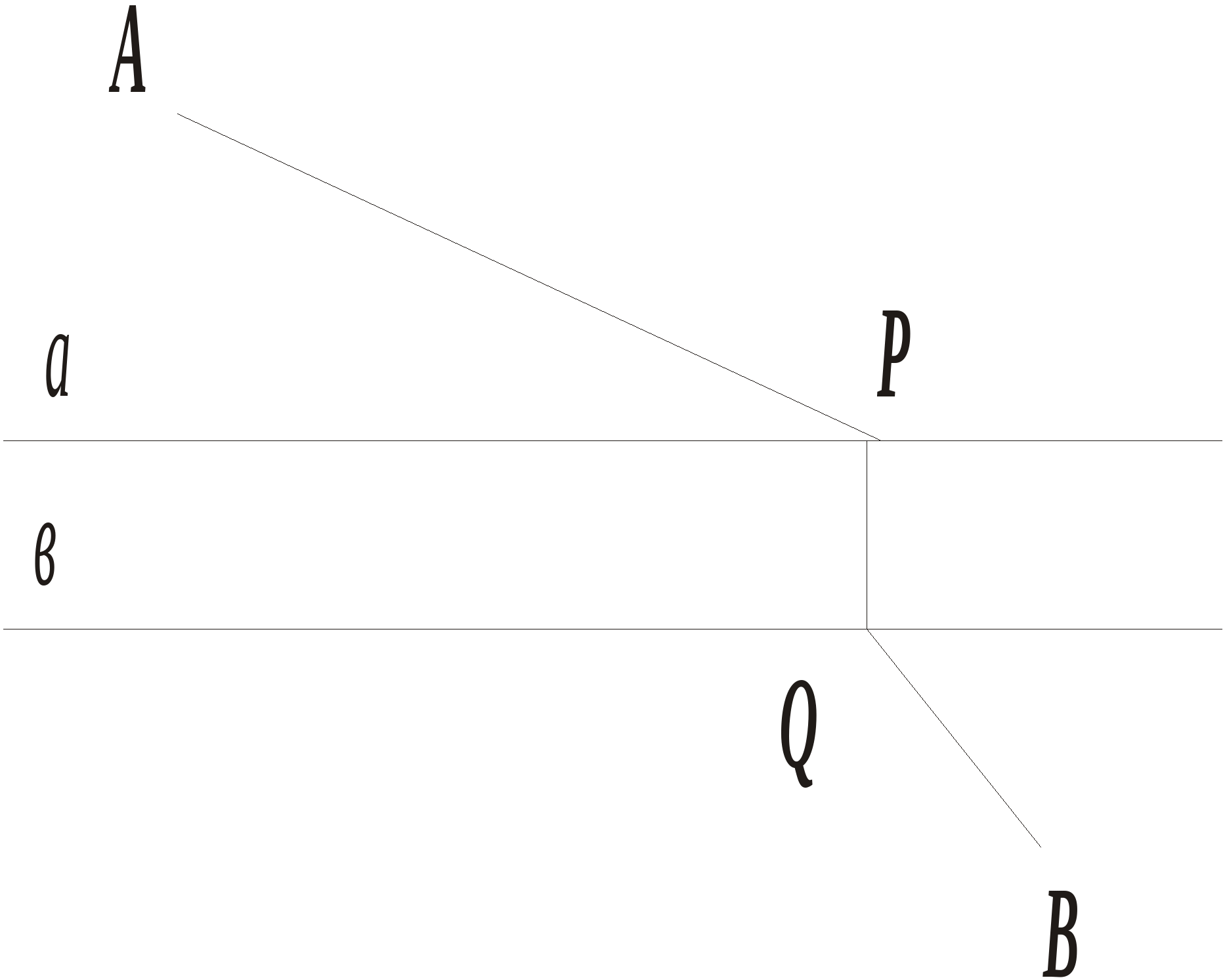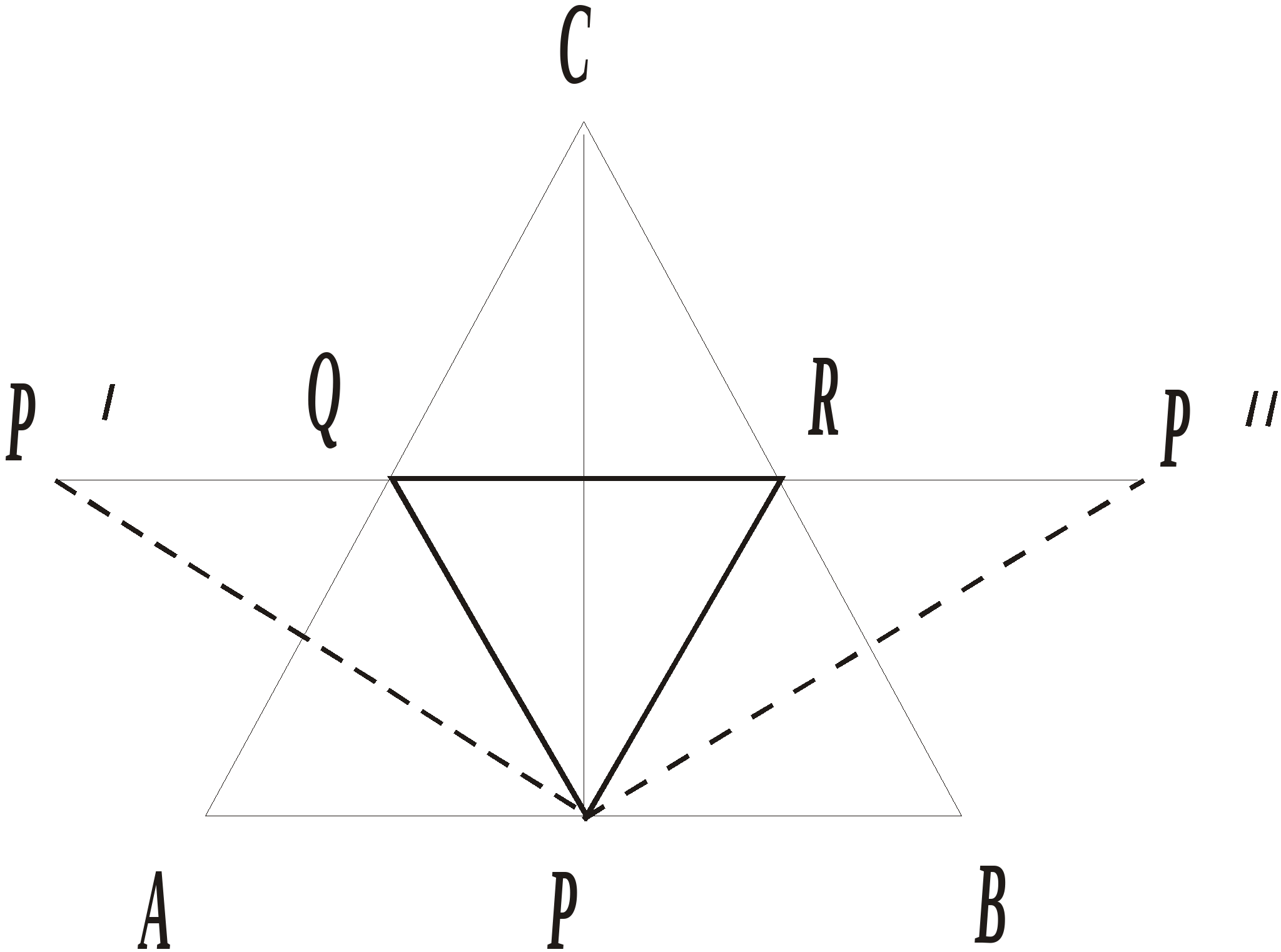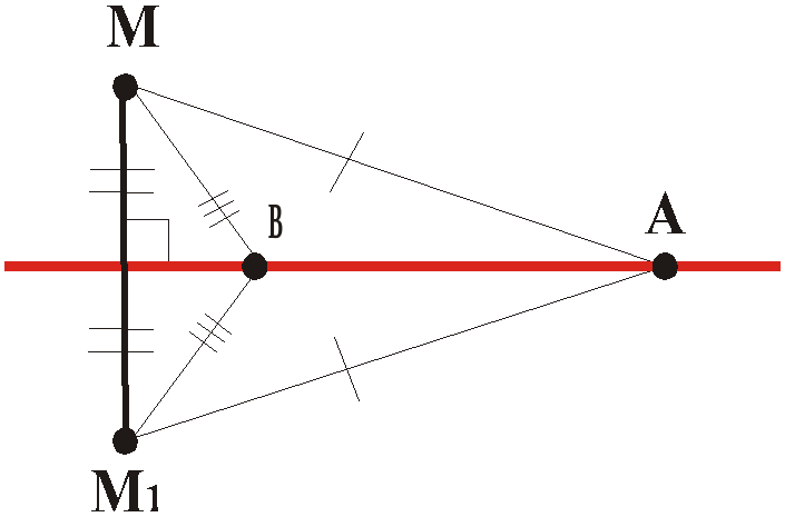 Рис.8 Возьмём теперь произвольную точку М, отличную от О. Допустим, что она лежит внутри угла АОВ (остальные случаи рассматриваются аналогично). При симметрии относительно прямой l точка М перейдёт в такую точку N, что ОN = ОМ и ∟АОN=∟АОМ. Точка N, в свою очередь, при симметрии относительно прямой l перейдёт в такую точку М1, что ОМ1=ОN и ∟ВОМ1=∟ВОN=∟АОВ+∟АОN=∟АОВ+∟АОМ . Поэтому ∟АОМ1=∟ВО М1 +∟АОВ=2∟АОВ+∟АОN.+∟АОМ, а значит, ∟М1ОМ=2∟АОВ. Итак, точка О осталась на месте, а произвольная точка М перешла в такую точку М1, что ОМ1=ОМ и ∟М1ОМ=2∟АОВ. Кроме того, направление поворота вокруг точки О от ОМ к ОМ1 такое же, как от ОА к ОВ (на рис. против часовой стрелки). Это означает, что результатом композиции двух осевых симметрий с пересекающимися осями является поворот вокруг точки пересечения осей на угол, вдвое больший угла между осями. Очевидно, что частным случаемкомпозиции двух осевых симметрий с пересекающимися в точке О под углом 90о осями является поворот на 180о, т.е. центральная симметрия с центром в точке O. Из рассмотренных случаев вытекает важное свойство осевой симметрии: осевая симметрия сохраняет величину угла, но меняет его ориентацию. Поскольку и поворот, и параллельный перенос представляют собой результат композиции двух осевых симметрий, то каждое из этих движений сохраняет не только величину угла, но и его ориентацию. 6. Исследование возможности существования других видов движений. В п.4 данного реферата были рассмотрены три вида движений: параллельный перенос, поворот и осевая симметрия (скользящая симметрия не включена в этот список, поскольку представляет собой композицию движений; также напомним, что центральная симметрия и тождественное отображение являются частными случаями основных движений). Возникает вопрос: а существуют ли какие-то другие движения, отличные от перечисленных? Важной характеристикой движения плоскости является множество его неподвижных точек. Оно устроено просто, и могут представиться лишь следующие четыре возможных случая: движение оставляет неподвижными три точки плоскости; движение оставляет неподвижными две точки плоскости; движение оставляет неподвижной одну точку плоскости; у движения неподвижных точек нет. Попробуем решить поставленный вопрос при помощи исследований каждого из этих случаев отдельно. Исследование 6.1. Пусть при некотором движении φ остались неподвижными три точки плоскости - А, В, С, не лежащие на одной прямой. Попытаемся определить вид движения φ. В результате движения φ произвольная точка плоскости М переходит в точку М1. По определению движения М1А=МА (рис.9). Рис.9 Если точки М1 и М различные, то точка А лежит на серединном перпендикуляре к отрезку ММ1. Аналогично точки В и С лежат на серединном перпендикуляре к отрезку ММ1. Но по условию точки А, В, С, не лежат на одной прямой. Следовательно, точки М1 и М не могут быть различными, а значит, они совпадают. Таким образом, рассматриваемое движение переводит каждую точку плоскости в себя, т.е. является тождественным отображением. Вывод: если движение φ оставляет неподвижным три неколлинеарные точки плоскости, то это движение – тождественное отображение (φ = ε). Исследование 6.2. Пусть при некотором движении φ остались неподвижными две точки плоскости - А и В. Попытаемся определить вид движения φ. Рис.10 Если точки М и М1 совпадают, то φ = ε, по