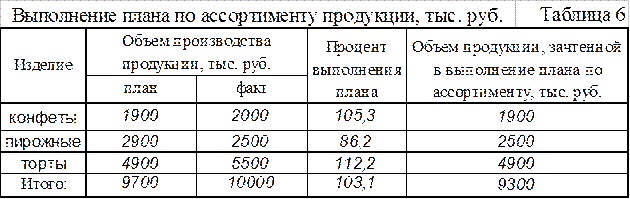 Оценка выполнения плана по ассортименту продукции обычно производится с помощью одноименного коэффициента, который рассчитывается путем деления общего фактического выпуска продукции, зачтенного в выполнение плана по ассортименту, на общий плановый выпуск продукции. Из таблицы видно, что план по ассортименту продукции выполнен на 96 %: