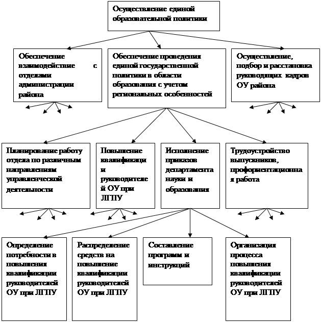 Рисунок 1 - Дерево целей 4. Организационная структура отдела народного образования города Данкова является линейной и предполагает двухуровневое руководство, которое существует в различных подразделениях органов местного самоуправления, таких как администрации района. На рисунке 2. видно, что существует два вертикальных уровня в качестве 2 заместителей и три горизонтальных, в которые входят ведущие специалисты. В целом по системе управления есть один начальник Отдела, два его заместителя, пять специалистов и методисты.