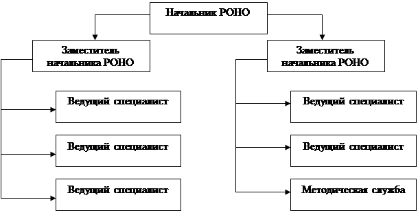 Рисунок 2 - Организационная структура Несоответствий нет, все цели распределены правильно. В функции начальника РОНО входит осуществление единой образовательной политики, что соответствует вершине «дерева целей». Более нижний уровень выполняет также и заместитель начальника РОНО. Третий уровень целей соответствует менеджерам среднего звена, а именно ведущим специалистам, в том числе и заместителю начальника РОНО. Самый низший уровень «дерева целей» осуществляют только ведущие специалисты. 6. Авторы концепции высказывают предположение, что наиболее важным фактором эффективности стиля руководства является уровень развития (зрелости) подчиненных менеджера. Анализируя различные сочетания ориентации на лидерство и поддержку (известных как ориентация на рабочие задачи и на взаимоотношения), П. Герси и К. Бланчард выделяют такие стили руководства как: приказной, тренировочный, поддерживающий и стиль делегирования, соответствующие уровням развития работников, предполагая, что стиль руководства должен изменяться в зависимости от ситуации.Руководитель РОНО – делегирование (распределение обязанностей между подчиненными, осуществление функций контроля и мотивации).Заместитель Начальника РОНО – делегирование (распределение обязанностей между подчиненными, осуществление функций контроля и мотивации).Заведующий отделов кадров – делегирование (распределение обязанностей между подчиненными, осуществление функций контроля и мотивации).Ведущие специалисты – приказания (выполнение приказов высшего звена).7. К средствам и каналам коммуникации относятся документы, личное общение, связь по телефону. Основным видом коммуникаций в отделе являются устные сообщения. Это обусловлено не только близким расположением рабочих мест сотрудников, но и наименьшими затратами, что актуально для муниципального заведениями в условиях кризиса. Бумажный документооборот является единственным средством коммуникации в РОНО в связи с внешней средой. Только у одного заместителя находится в распоряжении электронная почта. Электронный документооборот находится на начальной стадии. К коммуникативным барьерам можно отнести отсутствие автоматизации в муниципальном учреждении.В муниципальном учреждении находится 5 принтеров и 1 сканер, а также 4 персональных компьютера. В каждом кабинете имеется городской телефон. В РОНО факс – телефон не предусмотрен. Наличие узкого перечня средств коммуникаций снижает эффективность управленческого процесса, и не соответствует предъявляемым требованиям к муниципальным учреждениям.8. Контроль выполнения планов и программ четко прописан в «Приказе об обязанностях аппарата управления». Начальник РОНО контролирует ход выполнения намеченных программ по капитальному строительству и капитальному ремонту. Оба заместителя начальника обеспечивают контроль исполнения приказов департамента науки и образования, постановлений главы администрации и решений районного совета депутатов по вопросам образования, планов и программ, постановлений коллегии департамента, Советов РОНО, приказов по отделу, по курирующим вопросам. Специалистами осуществляется контроль в следующих направлениях: преподавание учебных дисциплин, выполнение Закона РФ "Об образовании", условиями жизни и воспитания детей-сирот и детей, 