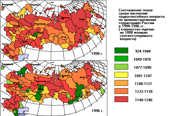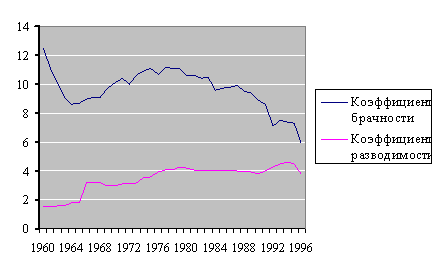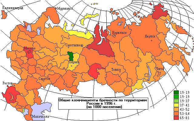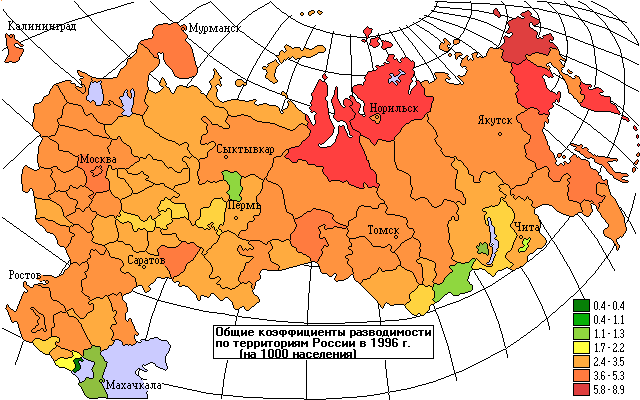 Максимальные значения общих коэффициентов разводимости в 1996 г. были зафиксированы в столичном регионе: Москва - 5,1; Московская область - 4,6; Калининградская - 4,8; Мурманская - 5,0; Сахалинская - 4,6; Камчатская - 5,9 области с областными центрами, являющимися крупными портовыми городами. Представляющаяся вполне благополучной Самарская область - 4,8; и территории с экстремальными природно-климатическими условиями: Хабаpовский край - 4,7; Тюменская область - 5,3; Таймырский (Долгано- Ненецкий) национальный округ- 5,8; Магаданская область - 6,1; Ямало-Ненецкий национальный округ - 6,8; Чукотский автономный округ - 8,9 на 1000 населения. Минимальные значения общего коэффициента разводимости были характерны, преимущественно для национальных территориальных образований: Республик Калмыкии - 2,9; Кабаpдино-Балкаpии - 2,9; Мордовии - 2,8; Удмуpтской - 2,7; Карачаево-Черкесской - 2,7; Бурятии - 2,6; Алтая - 2,6; Марий Эл - 2,5; Чувашской - 2,4; Севеpной Осетии-Алании - 2,2; Тывы - 1,3; Дагестана - 1,1; Ингушетии - 0,4; а также для национальных округов Агинского Бурятского - 1,7; Коми-Пермяцкого - 1,2; Усть-Ордынского Бурятского - 1,1.