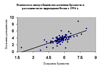 Нетрудно заметить, что имеется определенные соответствия между процессами брачности и разводимости по территориям России - для территорий с более высокими значениями коэффициентов брачности характерны более низкие значения показателей разводимости и наоборот. Эта взаимосвязь в графической форме хорошо выражена на рис. 2.