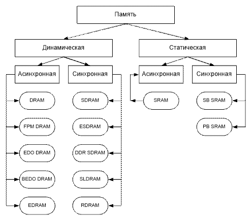Рис. 1. Классификация ОЗУ Динамическая оперативная память (Dynamic RAM – DRAM) используется в большинстве систем оперативной памяти ПК. Основное преимущество этого типа памяти состоит в том, что ее ячейки упакованы очень плотно, т.е. в небольшую микросхему можно упаковать много битов, а значит, на их основе можно построить память большей емкости. Ячейки памяти в микросхеме DRAM – это крошечные конденсаторы, которые удерживают заряды. Проблемы, связанные с памятью этого типа, вызваны тем, что она динамическая, т.е. должна постоянно регенерироваться, так как в противном случае электрические заряды в конденсаторах памяти будут “стекать”, и данные будут потеряны. Важнейшей характеристикой DRAM является быстродействие, а проще говоря, продолжительность цикла + время задержки + время доступа, где продолжительность цикла – время, затраченное на передачу данных, время задержки – начальная установка адреса строки и столбца, а время доступа – время поиска самой ячейки. Измеряется в наносекундах. Существует тип памяти, совершенно отличный от других - статическая оперативная память (Static RAM – SRAM). Она названа так потому, что, в отличие от динамической оперативной памяти, для сохранения ее содержимого не требуется периодической регенерации. Но это не единственное ее преимущество. SRAM имеет более высокое быстродействие, чем динамическая оперативная память, и может работать на той же частоте, что и современные процессоры. Микросхемы SRAM не используются для всей системной памяти потому, что по сравнению с динамической оперативной памятью быстродействие SRAM намного выше, но плотность ее намного ниже, а цена довольно высокая. Более низкая плотность означает, что микросхемы SRAM имеют большие габариты, хотя их информационная емкость намного меньше. Несмотря на это, разработчики все-таки применяют память типа SRAM для повышения эффективности ПК. Но во избежание значительного увеличения стоимости устанавливается только небольшой объем высокоскоростной памяти SRAM, которая используется в качестве кэш-памяти. В переводе слово «cache» (кэш) означает «тайный склад», «тайник». Тайна этого склада заключается в его «прозрачности» — адресуемой области памяти для программы он не добавляет. Кэш является дополнительным быстродействующим хранилищем копий блоков информации из основной памяти, вероятность обращения к которым в ближайшее время велика. Кэш не может хранить копию всей основной памяти, поскольку его объем во много раз меньше объема основной памяти. Он хранит лишь ограниченное количество блоков данных и каталог — список их текущего соответствия областям основной памяти. Кроме того, кэшироваться может и не вся оперативная память, доступная процессору: во-первых, из-за технических ограничений может быть ограничен максимальный объем кэшируемой памяти; во-вторых, некоторые области памяти могут быть объявлены некэшируемыми (настройкой регистров чипсета или процессора). Если установлено оперативной памяти больше, чем, возможно, кэшировать, обращение к некэшируемой области ОЗУ будет медленным. Таким образом, увеличение объема ОЗУ, теоретически всегда благотворно влияющее на производительность, может снизить скорость работы определенных компонентов, попавших в некэшируемую память. Основная память состоит из регистров. Регистр - это устройство для временн