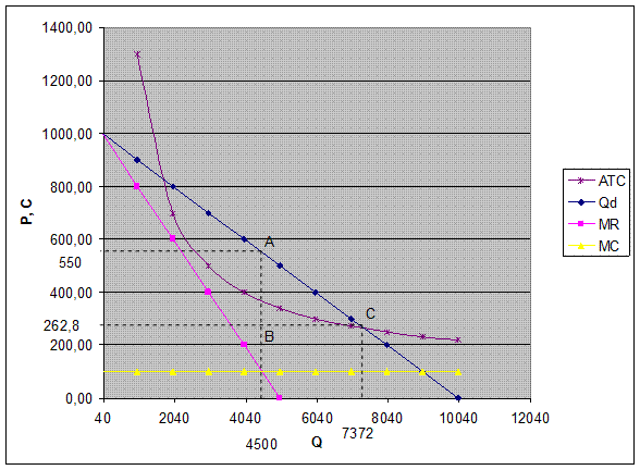 Затраты монополиста: 1200000+100*4500 = 1650000 долл.