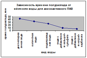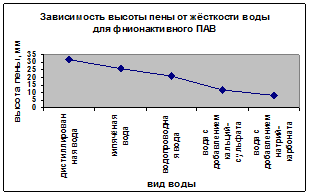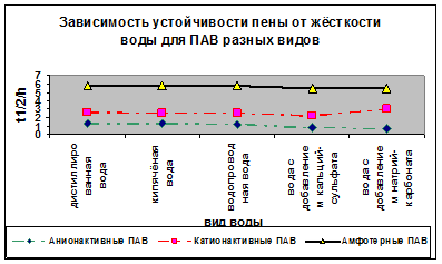 В образцах воды с добавлением кальций - сульфата и натрий – карбоната пузырьки пены имеют большие размеры, чем у дистиллированной, кипячёной и водопроводной воды. Объём пены отличается. В очень жесткой воде образуются хлопья белого цвета. По данным таблицы 1 были построены графические зависимости высоты пены и времени полураспада пены от жёсткости воды для анионактивного ПАВ, расположив виды по мере увеличения жёсткости, или общему количеству ионов: