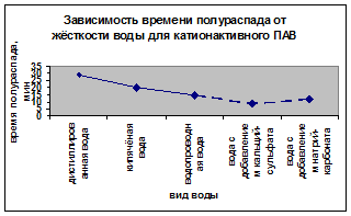* Время полного распада пены. Во всех случаях пена не очень большого объёма. С добавлением кальций - сульфата и натрий – карбоната образуются хлопья. В образцах воды с добавлением кальций - сульфата и натрий – карбоната пузырьки пены имеют немного большие размеры, чем у дистиллированной, кипячёной и водопроводной воды. Результаты этой части опыта показали, что жёсткость воды действует на пенообразование и устойчивость пены для катионактивных ПАВ. При увеличении жёсткость воды устойчивость такой пены уменьшается. По данным таблицы 2 были построены графические зависимости пены и времени полураспада пены от жёсткости воды для катионоактивного ПАВ, расположив виды воды по мере увеличения жёсткости, или общего количества ионов: