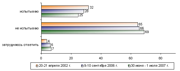 Четверть опрошенных (25%) заявляют, что испытывают раздражение и неприязнь по отношению к представителям той или иной национальности, причем чаще всего об этом говорят москвичи (42%). 69% сказали, что такой неприязни не испытывают; чаще других – люди старшего возраста (74%), респонденты с низкими доходами (76%) и жители сел (74%). Причем доля испытывающих подобные эмоции постепенно снижается: так, в 2002 году о своей неприязни к представителям других национальностей говорили 32% участников опроса, а в 2006 году – 28%.