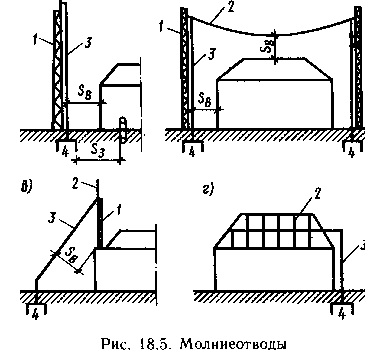 4. Зона защиты молниеотвода представляет собой объем конуса, высота которого равна 0,8*5 им для зоны, типа А и 0,92 им — типа Б (им — высота молниеотвода). На уровне земли зона защиты образует круг радиусом Го, для зоны типа А го==(1,1—0,002/1м)Ам, для зоны типа Б Го==1,5/1м. В тросовом молниеотводе (рис. 18.5, б) в качестве молниеприемника используется горизонтальный трос, который закрепляется на двух опорах. Токоотводы присоединяются к обоим концам троса, прокладываются по опорам и присоединяются каждый к отдельному заземлителю. При установке молниеотвода на здании должно быть обеспечено безопасное расстояние Sв по воздуху между токоотводом и защищаемым объектом, исключающее возможность электроразряда между ними (рис. 18.5, в). Кроме того, для предупреждения заноса высоких потенциалов через грунт должно быть обеспечено безопасное расстояние Sз между заземлителем и металлокоммуникациями , входящими в здание (см. рис. 18.5, а); оно определяется по формуле Sз==0,5 Rи и должно быть не менее 3 м; Rн — импульсное электросопротивление заземлителя. Импульсное электросопротивление заземлителя для каждого токоотвода на объектах I категории защиты должно быть не более 10 Ом. Типовые конструкции заземлителей, удовлетворяющие этому требованию, приведены в инструкции СН 305—77. Для защиты от ударов молнии объектов II категории применяют отдельно стоящие или установленные на защищаемом объекте не изолированные от него стержневые и тросовые молниеотводы. Допускается использование в качестве молниеприемника металлической кровли здания или молниеприемной сетки (из проволоки диаметром 6...8 мм и ячейками 6Х6 м), накладываемой на неметаллическую кровлю (рис. 18.5, г). В качестве токоотводов рекомендуется использовать металлические конструкции зданий и сооружений, вплоть до пожарных лестниц на зданиях. Импульсное сопротивление каждого заземлителя должно быть не более 10 Ом, для наружных установок — не более 50 Ом. Защита объектов III категории от прямых ударов молнии организуется так же, как для объектов II категории, но требования к заземлителям ниже: импульсное электросопротивление каждого заземлителя не должно превышать 20 Ом, а при защите дымовых труб, водонапорных и силосных башен, пожарных вышек—50 Ом. |