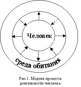 Введение. Необходимым условием существования человеческого общества является деятельность. Существует большое количество видов деятельности, которые охватывают практические, интеллектуальные и духовные процессы, протекающие в быту, общественной, культурной, производственной, научной и других сферах жизни. Модель процесса жизнедеятельности в наиболее общем виде можно представить состоящей из двух элементов: человека и среды его обитания. Между собой эти элементы связаны двухсторонними связями (рис.1).