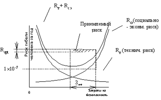 Таким образом, должны рассматриваться все технические и социальные аспекты в их взаимосвязи. При этом возможно обеспечить приемлемый риск, который сочетает в себе технические, экономические, социальные и политические аспекты и представляет собой некоторый компромисс между уровнем безопасности и возможностями ее достижения. Упрощенный пример определения приемлемого риска можно проиллюстрировать графиком (рис.5):