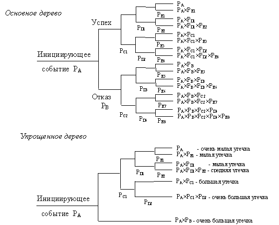 Рис.9. Способ упрощения дерева событий. На практике дерево отказов анализируют с помощью обычной инженерной логики и упрощают, отбрасывая “ненужные ” события. Например, если отсутствует электропитание (В), то никакие действия, предусмотренные на случай аварии, не могут производиться (не работают насосы, системы охлаждения и т.д.). В результате, упрощенное дерево отказов не содержит выбора в случае отсутствия электропитания и т.д. Таким образом, вторая стадия заканчивается определением всех возможных вариантов отказов в системе и нахождением значений вероятности для этих вариантов. Третья стадия : анализ последствий. При анализе последствий используются данные, полученные на стадии предварительной оценки опасности и на стадии выявления последовательности опасных ситуаций. По данным дерева отказов и полученным значениям вероятности возможных отказов можно построить гистограмму частот для различных величин утечек (на примере ядерного реактора).