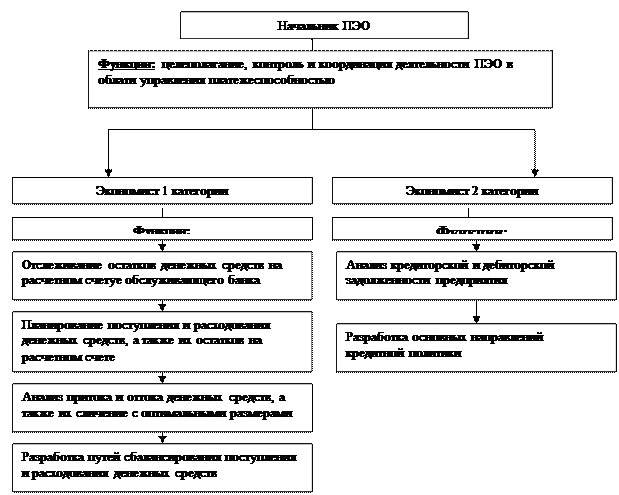 Распределение должностных обязанностей между структурными единицами, т.е. отделом бухгалтерии и планово-производственным отделом, и отдельными исполнителями приведено в таблице 2.1.2 Таблица 2.1.2 Распределение должностных обязанностей между структурными единицами и отдельными исполнителями функциональных подразделений в области управления платёжеспособностью