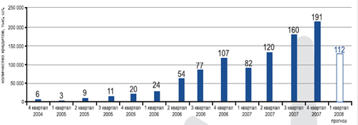 В 2006 году доля «кредитных» иномарок достигла 45% в общем объеме продаж. При сохранении существующих темпов роста рынка автокредитования можно предположить, что в 2007-2008 году уже каждый второй автомобиль на российском рынке будет продаваться с использованием кредитных схем.