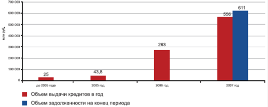 Таблица 4. Объем выдаваемых ипотечных кредитов в РФ 2005-2007 год, млрд. руб.