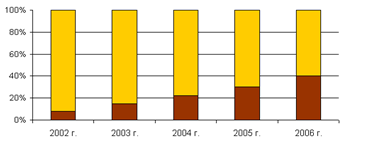 Программа представлена страховой компанией РОСНО: Данные диаграммы, на рисунке 1, отражают динамику увеличения доли продаж автомобилей в кредит от общего объема продаж автомобилей на российском рынке в 2002-2006 годах. В 2006 году доля «кредитных» автомобилей составила 35-40% от общего объема продаж. В диаграмме на рисунке 2 представлена динамика роста доли продаж в кредит иностранных автомобилей от общего объема продаж иномарок в 2002-2006 годах.