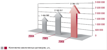Рис.5. Динамика роста заключенных договоров. В 2006 году РОСНО заключило около 2,8 миллионов договоров страхования, таким образом, прирост по сравнению с 2005 годом составил 32%.