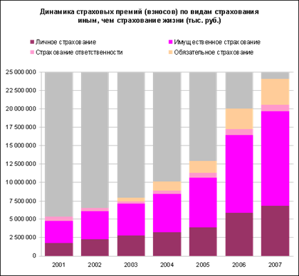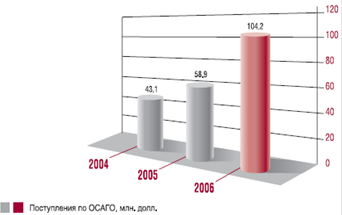Рис.4. Динамика собранных премий компанией ОАО «РОСНО». Объем рынка страхования, не связанного со страхованием жизни (без учета ОМС), вырос на 25% и составил 14,2 млрд. долл. Темпы роста по личному страхованию составили 25%, по страхованию имущества – 28%, по страхованию ответственности – 5%, обязательное страхование автогражданской ответственности (ОСАГО) выросло на 24%. За 2006 год произошло незначительное изменение в структуре рынка: доля имущественных видов выросла с 53% в 2005 году до 57% в 2006 году за счет сокращения доли страхования жизни до 4% в 2006 году (7% в 2005 году) и страхования ответственности до 4% в 2006 году (5% в 2005 году). По предварительным данным ФССН на 1 января 2007 года десять крупнейших страховых компаний собрали почти половину (48%) всей премии на российском рынке страхования, не включая обязательное медицинское страхование. Предположительно данная тенденция сохранится и даже усилится в будущем.