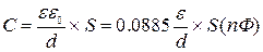 где в - толщина диэлектрика, см; S - площадь перекрытия верхней и нижней обкладок, см2 , она называется активной площадью конденсатора; ε0 - электрическая постоянная вакуума; ε0 = 8,854·10-12 Ф/м; ε - относительная диэлектрическая проницаемость материала диэлектрика. Емкость на единицу площади называется удельной емкостью конденсатора С0