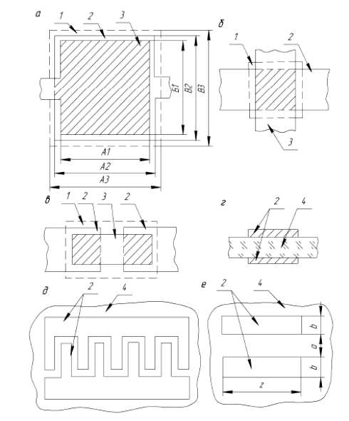 Рис.1.1 . Разновидности конструкций тонкопленочных конденсаторов: а – с активной площадью перекрытия обкладок S>5 мм2 ; б – с S = 1– 5 мм2 ; в, г – с S<1 мм2; д – гребенчатая; е – в виде двух параллельно расположенных проводящих пленок; 1 – диэлектрик; 2 – нижняя обкладка; 3 – верхняя обкладка; 4 – подложка 1.1. Расчет тонкопленочных конденсаторов без подстроечных секций Исходными данными для расчета ТПК являются следующие параметры: - номинальная величина емкости ТПКС, пФ; - диэлектрическая проницаемость ε; - рабочее напряжение на ТПК Uраб , В; - допустимая относительная погрешность емкости γС доп , %; - удельная емкость С0 , пФ/см2 ; - абсолютные производственные погрешности изготовления размеров верхней обкладки ∆l и ∆b, мм; - погрешность установки и совмещения масок ∆ly , мм; - максимальная температура окружающей среды t, °C; - предполагаемая длительность работы микросхемы Т, час. Проектирование однослойных ТПК следует начинать с выбора материала диэлектрической пленки (см. Приложение 1). Практика показывает, что диэлектрические пленки толщиной 2000 – 3000 A и менее, нередко оказываются не сплошными, и ТПК на их основе являются ненадежными элементами. Многие конденсаторы с такой толщиной диэлектрика после изготовления оказываются негодными из-за замыкания обкладок. Минимальная толщина диэлектрического слоя рассчитывается по формуле