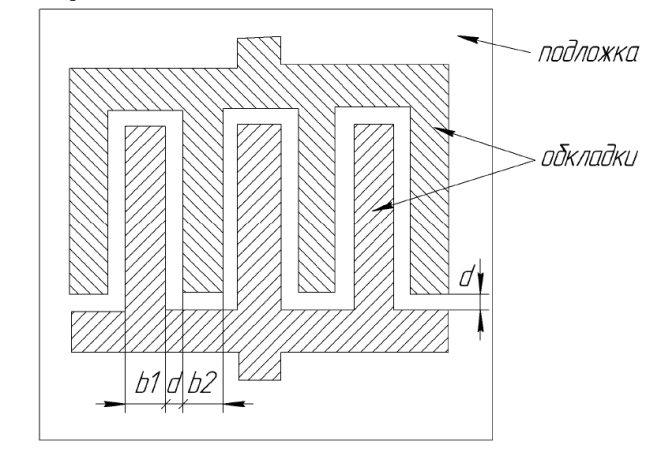 Рис. 1.2. Гребенчатый конденсатор Емкость такого конденсатора (пФ) в основном состоит из паразитной емкости, обусловленной краевым эффектом, и определяется по эмпирической формуле С = εр βl , ( 1.10 ) где β – коэффициент, зависящий от ширины пленочных проводников и расстояния между ними, определяется по графику [Приложение 2]; l – длина совместной границы проводников, см; εp – расчетное значение относительной диэлектрической проницаемости: для конденсатора, не имеющего защитного покрытия,