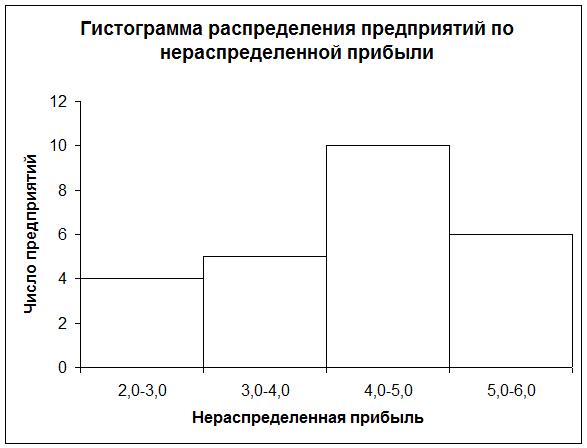 Вывод. Анализ интервального ряда распределения изучаемой совокупности предприятий показывает, что распределение предприятий по нераспределенной прибыли не является равномерным: преобладают предприятия с нераспределенной прибылью от 4,0 млн. руб. до 5,0 млн. руб. (это 10 предприятий, доля которых составляет 40%); самые малочисленная группа предприятий имеет 2,0 – 3,0 млн. руб., которая включает 4 предприятия, что составляет 16% от общего числа предприятий. 2. Нахождение моды и медианы полученного интервального ряда распределения графическим методом и путем расчетов Для определения моды графическим методом строим по данным табл. 4 (графы 2 и 3) гистограмму распределения фирм по изучаемому признаку.